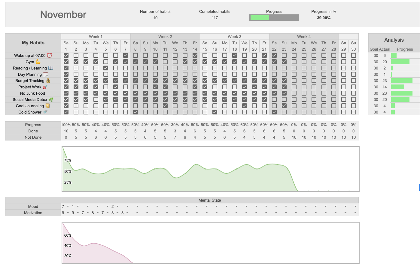 - Don't forget about your mental well-being! Use the charts to track how completing your habits affects your mental state!